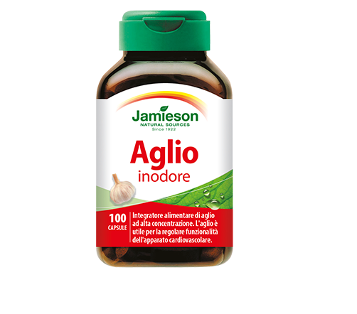 Aglio inodore L’aglio inodore di Jamieson contiene aglio ultra puro filtrato a freddo tramite un processo chiamato “metodo veloce di essiccazione” attraverso il quale l’odore viene eliminato senza denaturare i principi attivi. L’aglio è utile per regolare la funzionalità dell’apparato cardiovascolare e la pressione arteriosa; è utile per il metabolismo dei trigliceridi e del colesterolo. NON CONTIENE: glutine, sale (cloruro di sodio), amido, zucchero, lattosio, lievito.